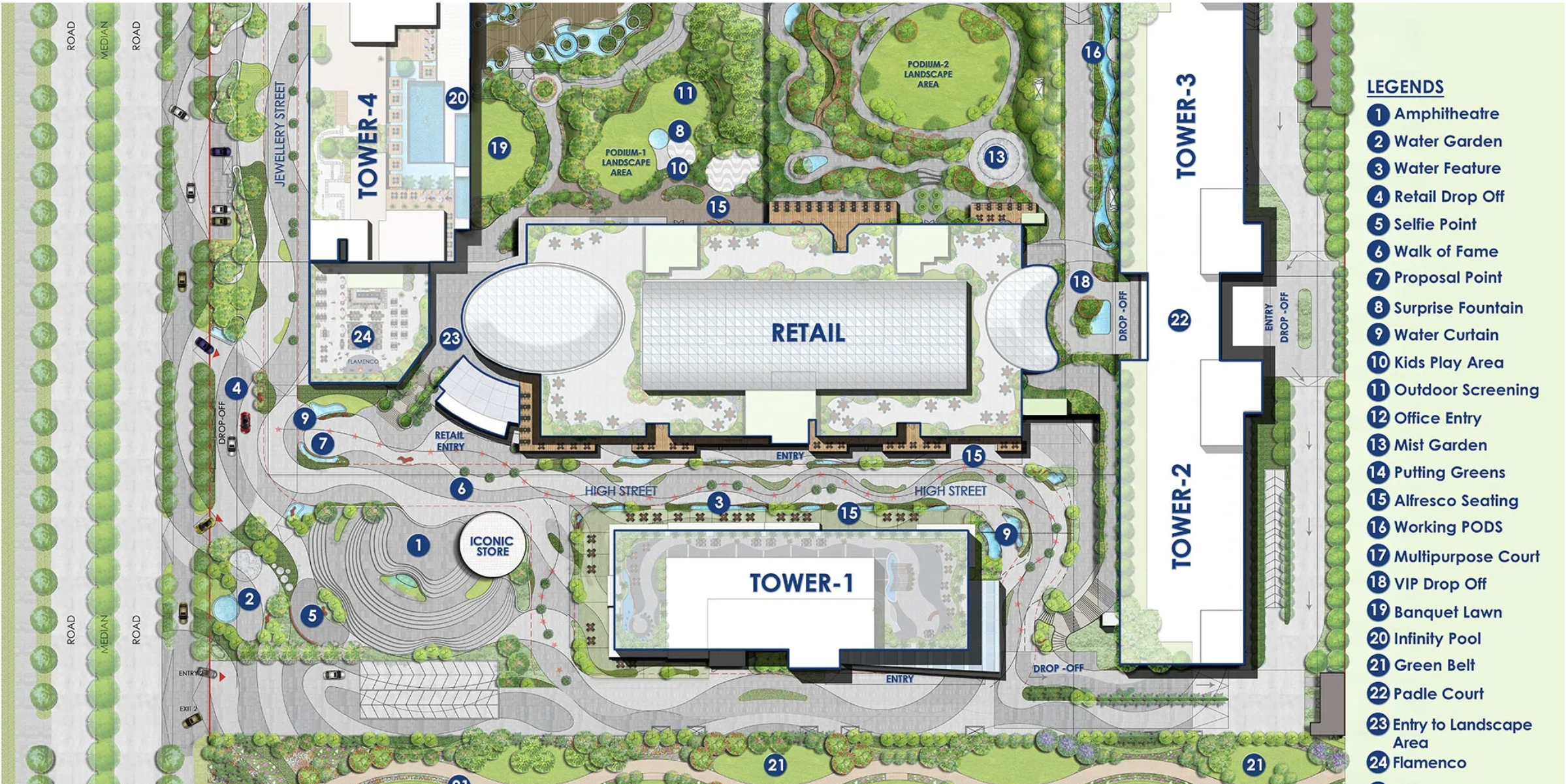 - Features spacious walkways, modern retail frontage, and landscaped areas creating a premium commercial destination.